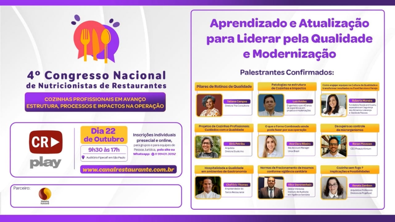 Canal Restaurante realizou em 22 de Outubro, o 4º Congresso Nacional de Nutricionistas de Restaurantes, maior evento do país para esta atividade, no formato PRESENCIAL e AO VIVO, exclusivamente para inscritos.