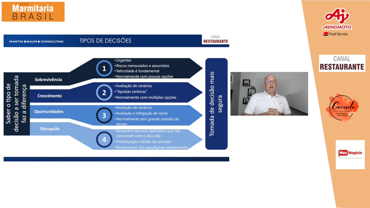 O empreendedor vive um drama neste momento: como tomar decisões em plena pandemia ? Pensar apenas no curto prazo ou planejar ? Sobreviver ou ousar crescer ? Flávio Nusbaum, sócio fundador da MartinBaum Consulting, consultor de empresas, apresenta método para ponderar a melhor decisão com clareza. O conteúdo faz parte da Série Marmitaria Brasil, iniciativa da Ajinomoto Food Service, Canal Restaurante e Guersola Consultoria.