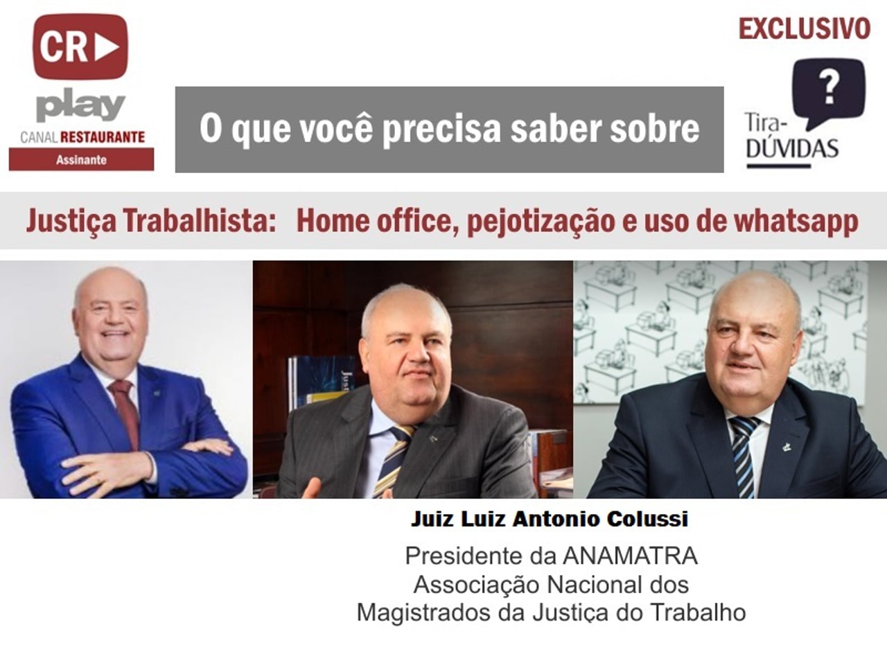 Em evento ao vivo especial, o Juiz Trabalhista Luiz Antônio Colussi, Presidente da ANAMATRA - Associação Nacional dos Magistrados do Trabalho - respondeu de forma franca e direta, suas visões sobre a transição dos hábitos de trabalho, e impactos na jurisprudência de julgamentos.