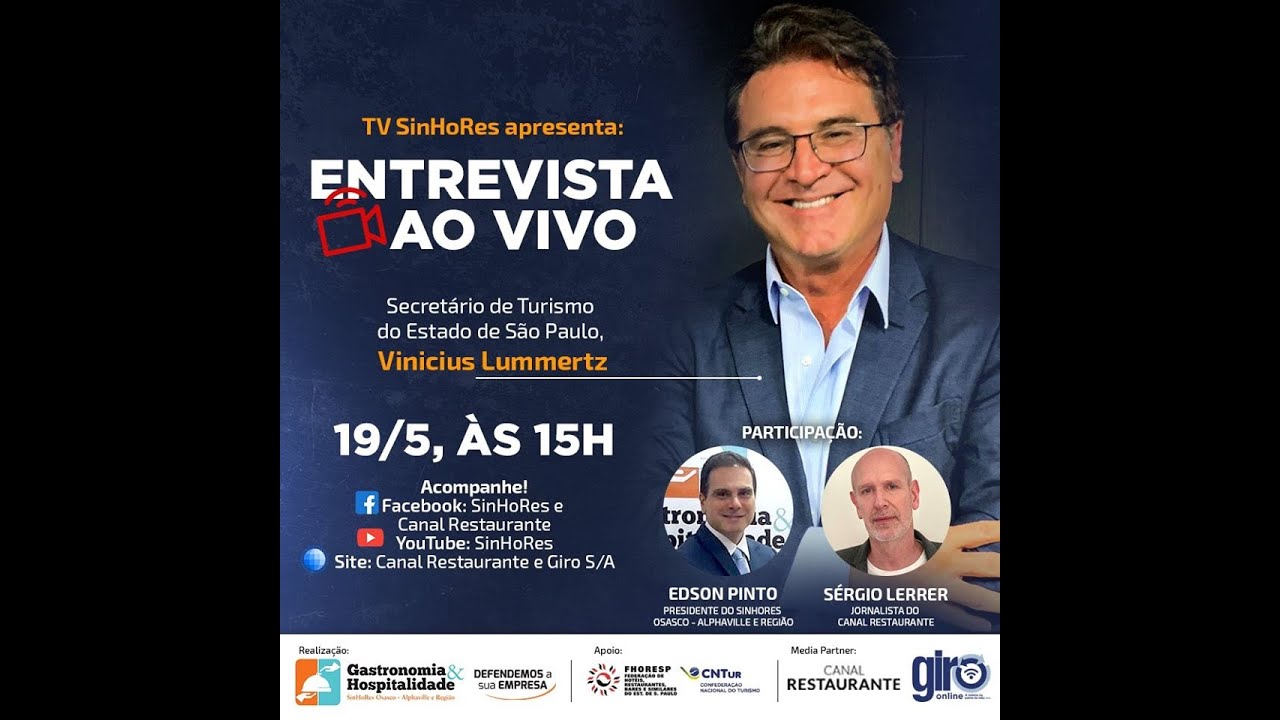 Entrevista ao Vivo com o Secretário de Turismo do Estado de São Paulo, Turismo Lummertz, moderada pelo jornalista Sergio Lerrer, e com a participação do Presidente do Sinhores Osasco, Alphaville e Região, Edson Pinto.