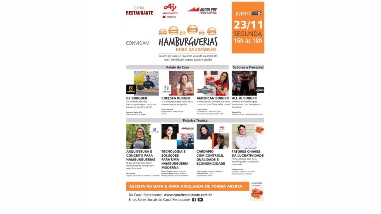Hamburguerias: Hora da Expansão - Relatos de cases, palestras técnicas e depoimentos de empreendedores. Uma visão sobre a maturidade e horizontes deste setor. Em evento promovido pela Ajinomoto Food Service, Middleby do Brasil, Guersola Consultoria e Canal Restaurante.