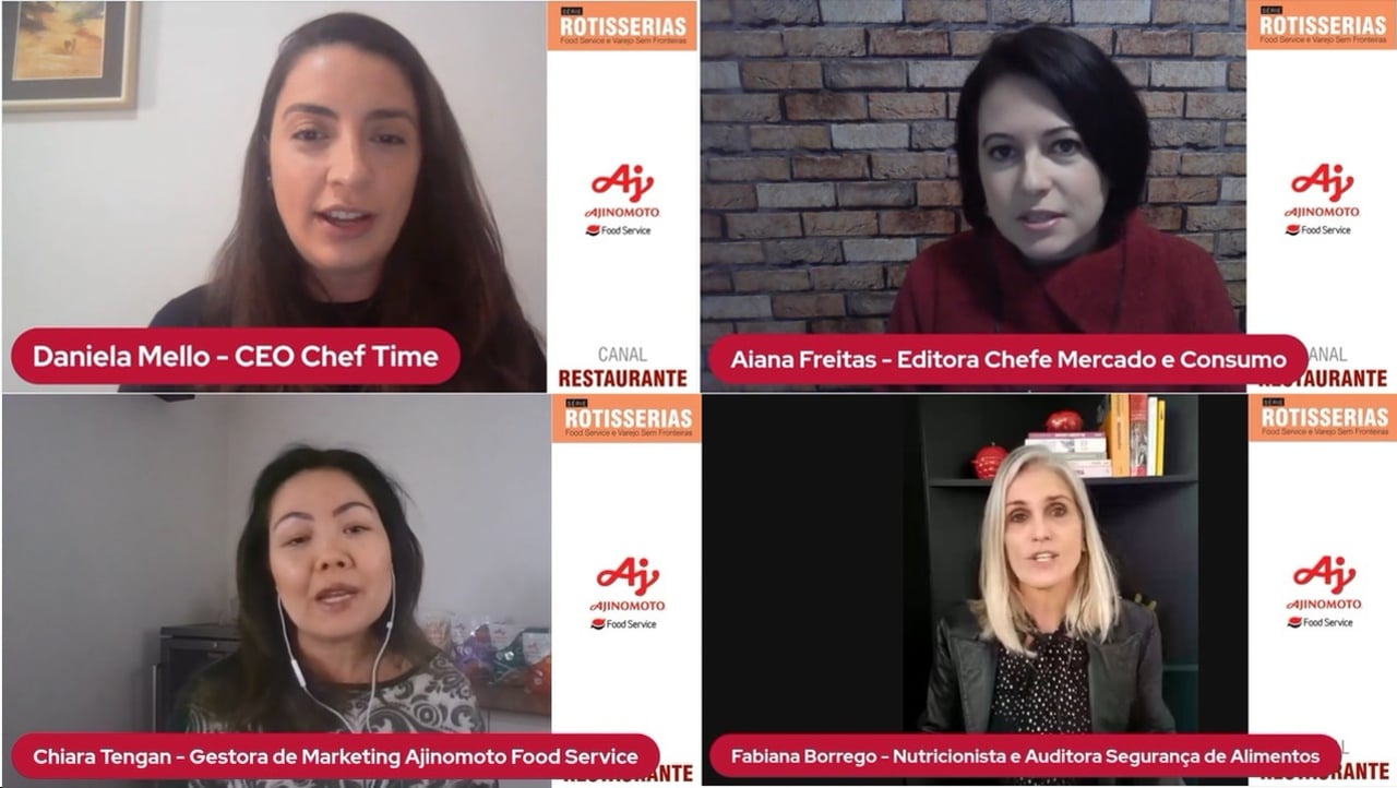 Participaram do debate: Daniela Mello, CEO da Cheftime, Aiana Freitas Editora Chefe da Mercado & Consumo, Fabiana Borrego fundadora da ChefNutri, Chiara Tengan, gestora de marketing da Ajinomoto Food Service, e Gabriel Torres, chef da Ajinomoto. Assista uma síntese do Debate, em iniciativa da Ajinomoto Food Service e Canal Restaurante.
