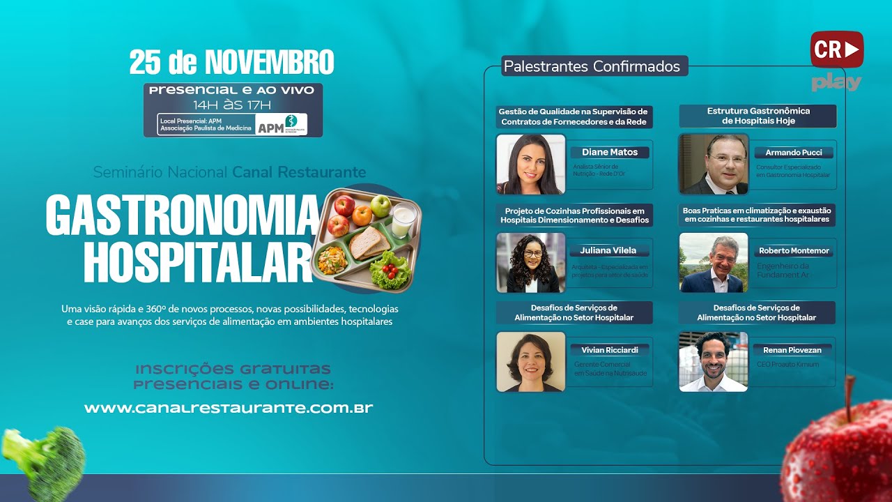 Hje AO VIVO, 25 de novembro, presencial e ao vivo, na sede da APM - Associação Paulista de Medicina, o Canal Restaurante estará realizando seu primeiro Seminário de Gastronomia Hospitalar.
